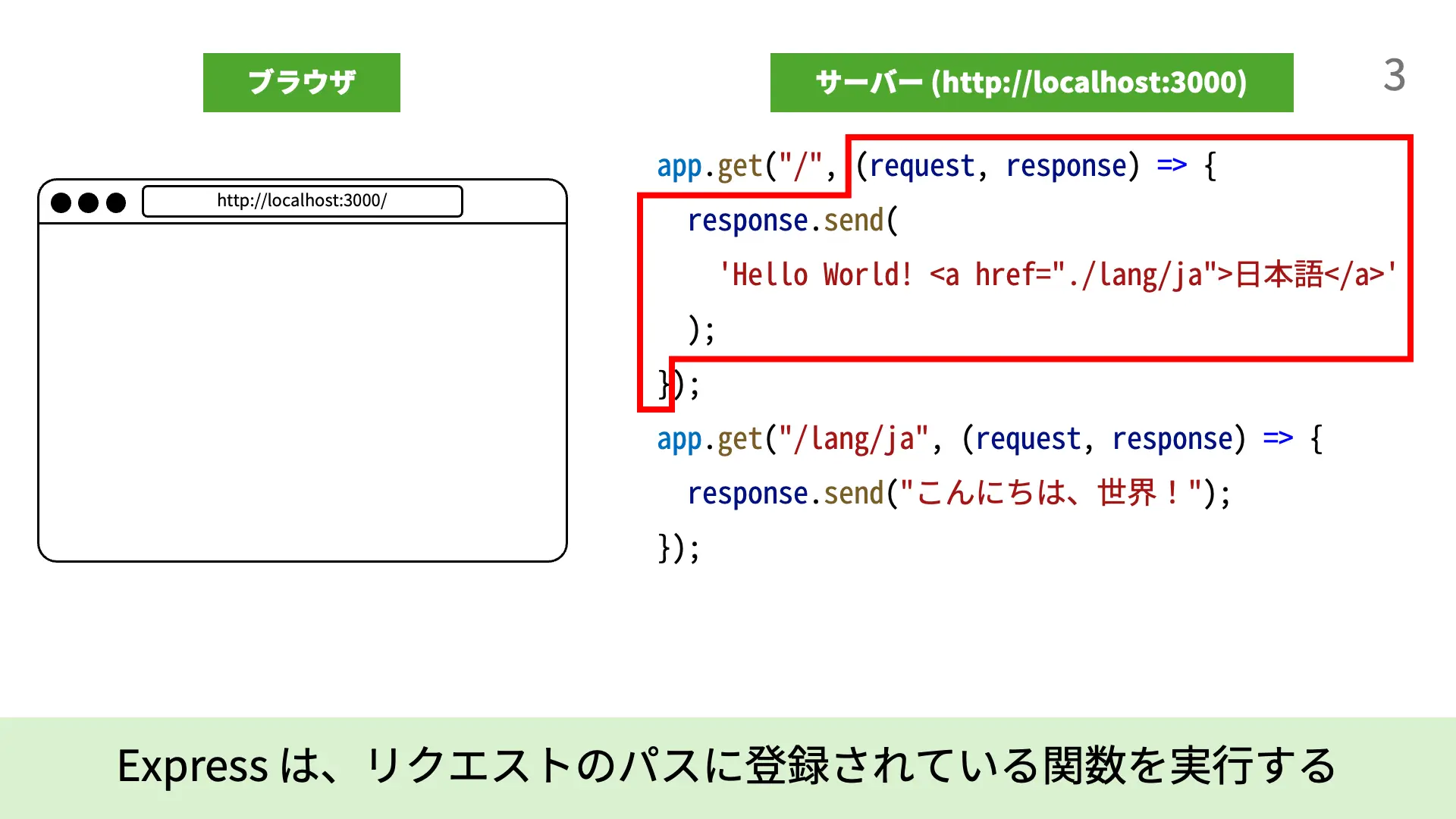 4. [5行目]response.send(`...`);により、Expressは`Hello World! <a href="./lang/ja">日本語</a>`という文字列をレスポンスとして送信します。